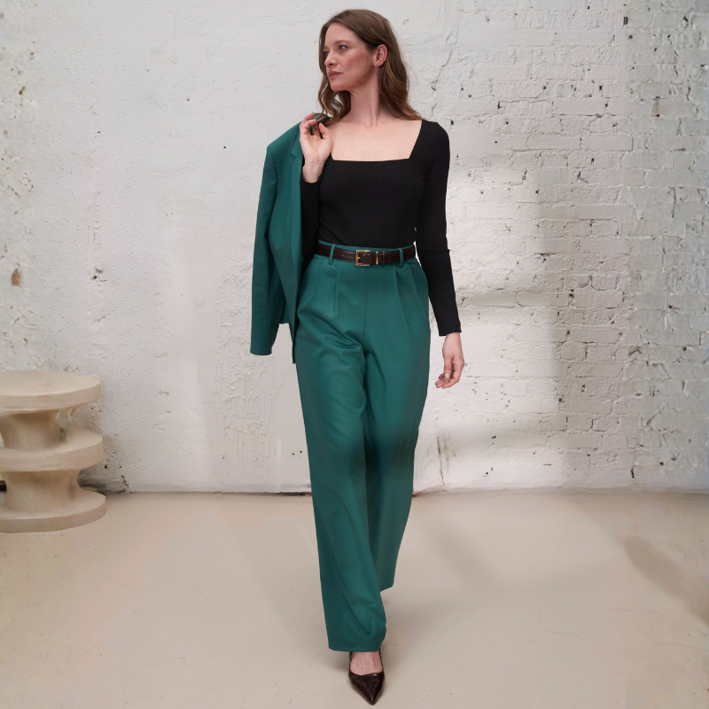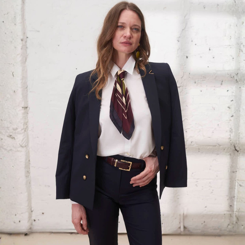 Ici aussi, tout dépend du style que vous souhaitez créer. Une veste blazer / veste de tailleur peut s'assortir parfaitement avec un pantalon cigarette pour un look structuré et ajusté, ou avec un pantalon large pour une allure à la fois fluide, moderne et décontractée. Nous proposons d'ailleurs d'autres types de coupes (carotte ou coupe droite par exemple) pour encore plus de looks.
