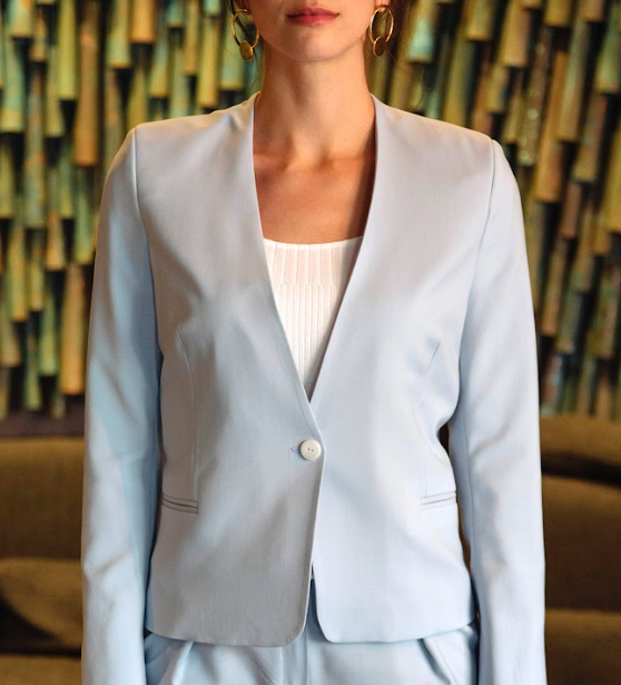 May Berthelot : chic urbain et modernité en tailleur bleu ciel 17H10