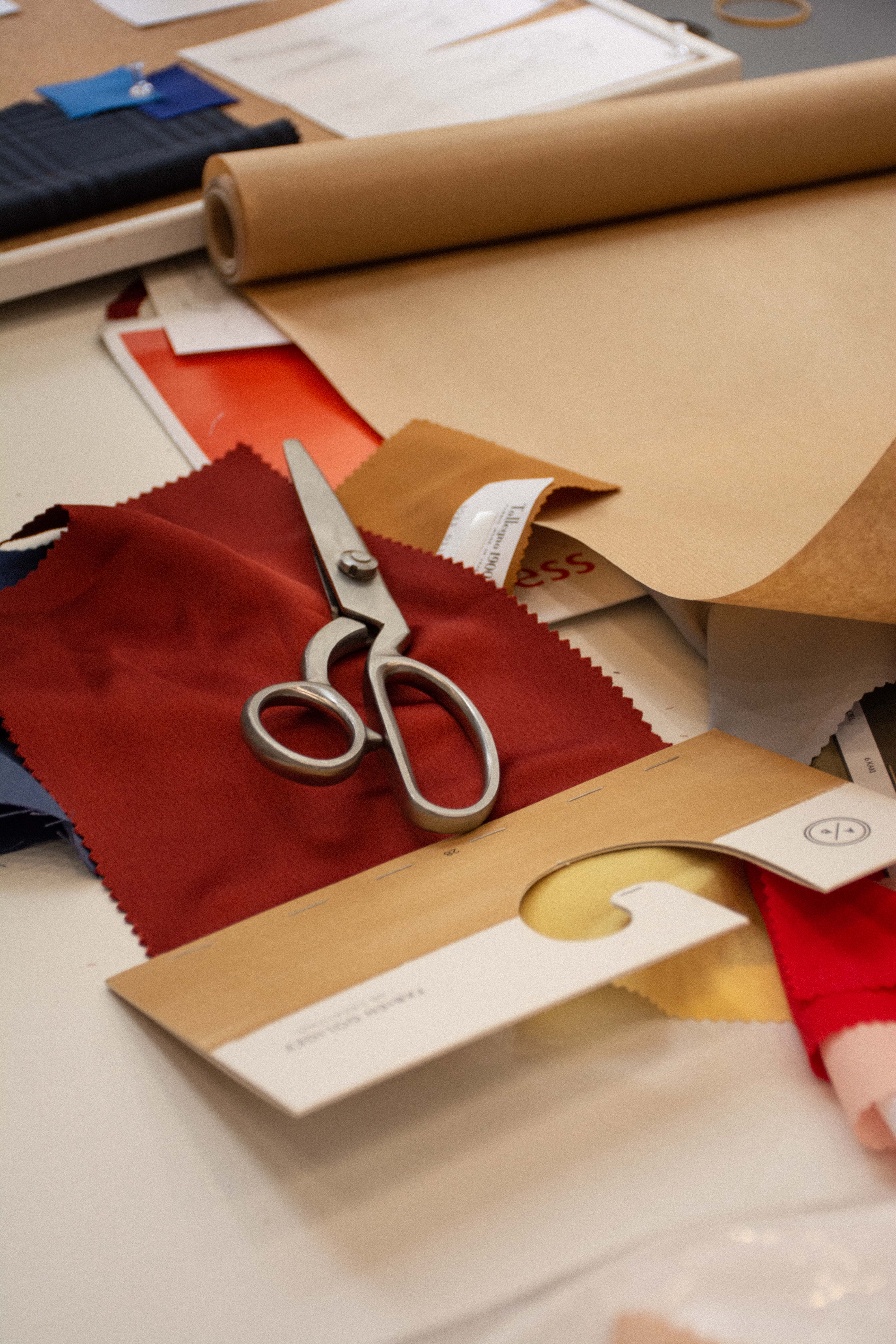- Fabric placement and cutting: Once the pattern is ready, each piece is cut with the utmost precision. Fabric placement is optimized to minimize waste and ensure a clean cut. On average, 1.75 meters of fabric are needed for a jacket, and between 2 and 2.4 meters for a patterned fabric.