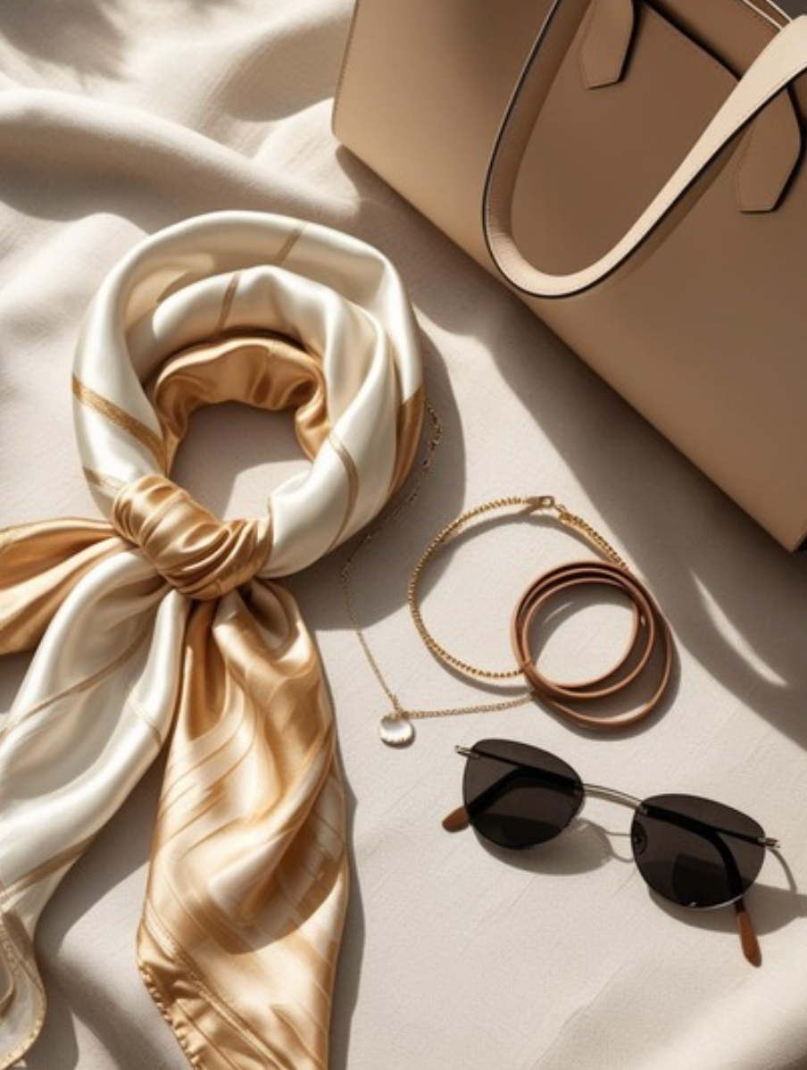 - Silk scarf tied over bag or hair