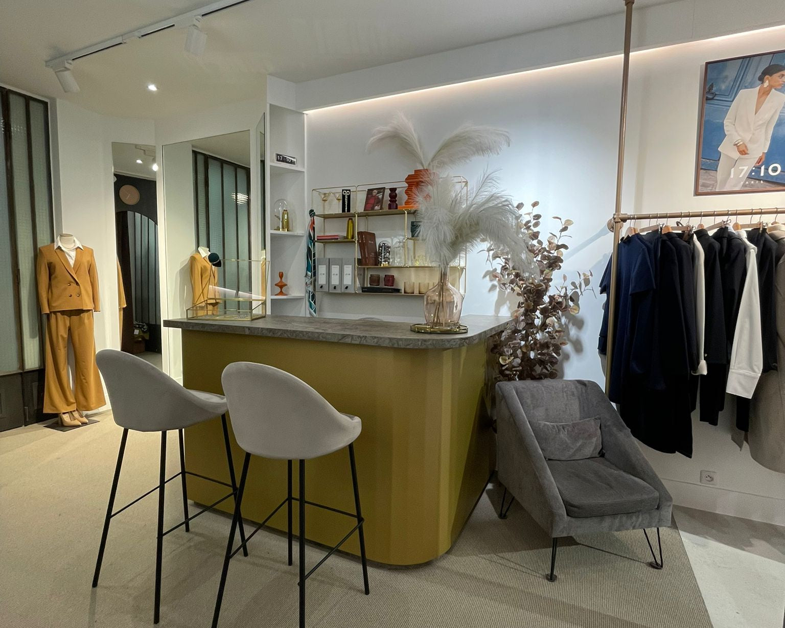Notre boutique 17H10 située au 12 rue du Cherche-Midi, Paris 6e, vous accueille dans un espace dédié au tailleur femme et au costume féminin structuré.